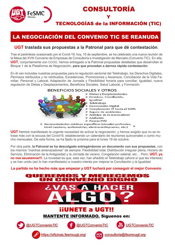 El pasado 15 de septiembre se celebró una nueva reunión de la Mesa del XVIII Convenio de Empresas de Consultoría e Investigación de Mercado (Convenio TIC). Nuestro compañero Miguel Marín está presente en estas reuniones como miembro de la federación estatal FeSMC-UGT. UGT y… Seguir leyendo →